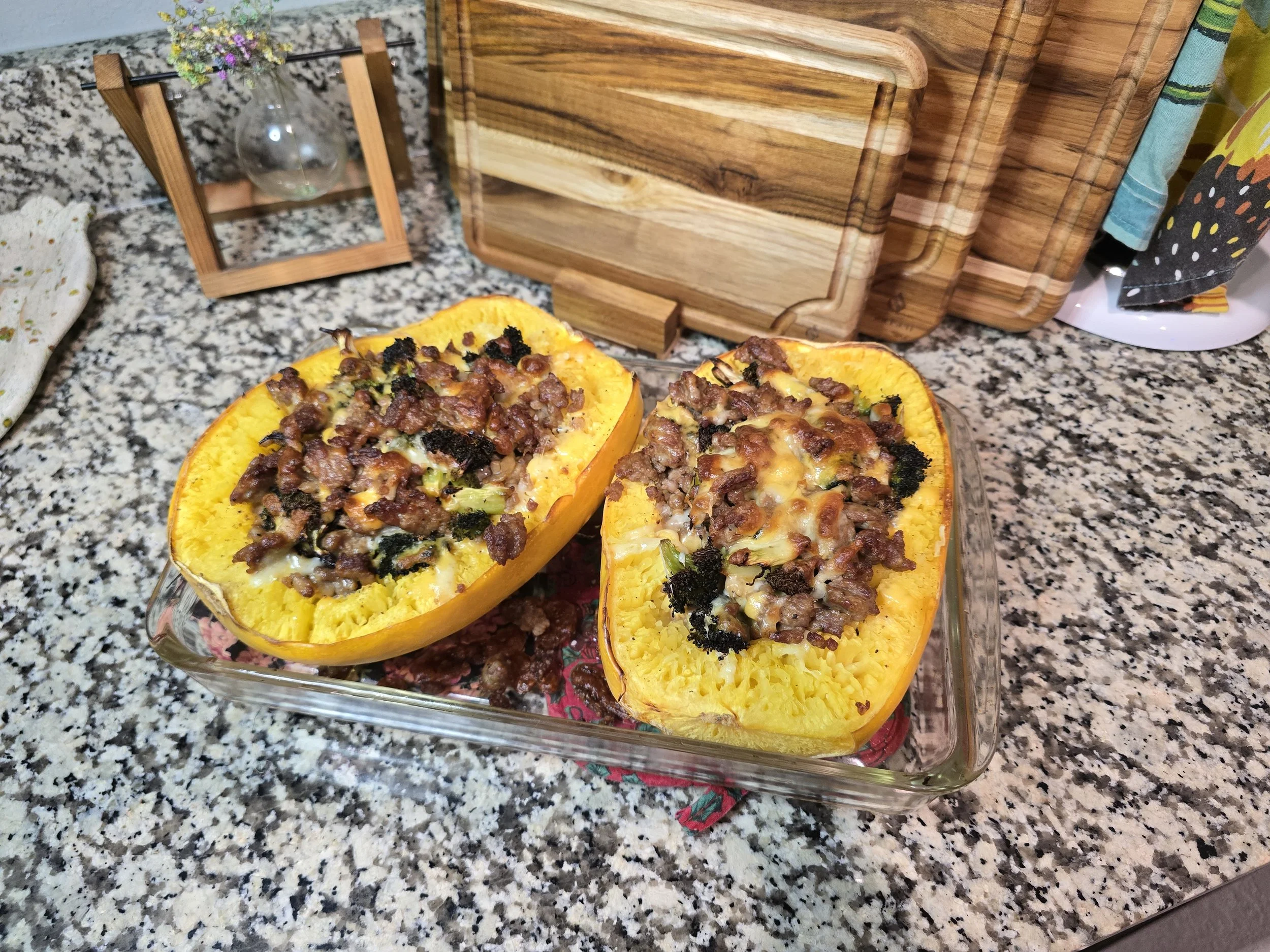 Broccoli, Sausage, and Cheddar Cheese Stuffed Spaghetti Squash